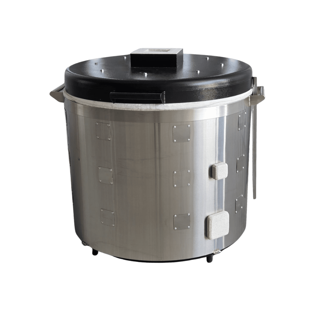 El interior está aislado con fibra cerámica de alta alúmina y ladrillos K-26 en el piso, materiales que garantizan estabilidad térmica, seguridad y un rendimiento superior en cada ciclo.
